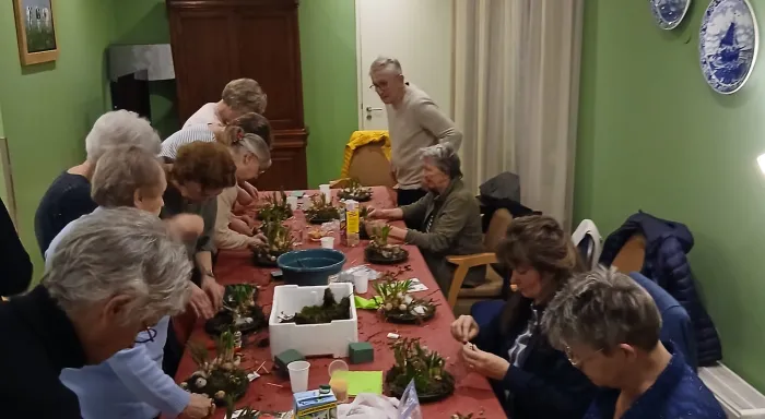 Daarna hebben we met z'n allen een leuk paasbakje gemaakt. 1 Van de vrijwilligers had dit helemaal voorbereid en een voorbeeld gemaakt. Na de uitleg kon iedereen zelf aan de slag. Ondertussen werd er gezellig met elkaar bijgepraat. Iedereen ging met een leuk voorjaars stukje naar huis. Het was een zeer geslaagde avond.